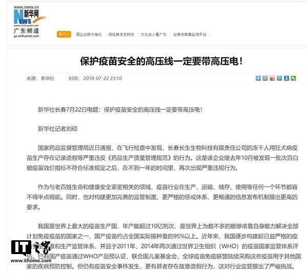 IT之家7月23日消息 這幾天,問題疫苗引發(fā)了全社會的熱烈關(guān)注,同時官方以及政府也對問題疫苗進行了表態(tài),而今天早上,新華社發(fā)表評論,稱社會需要加大處罰力度,要讓違法者傾家蕩產(chǎn)。新華社首先點明了背景,稱國家藥品監(jiān)督管