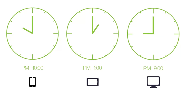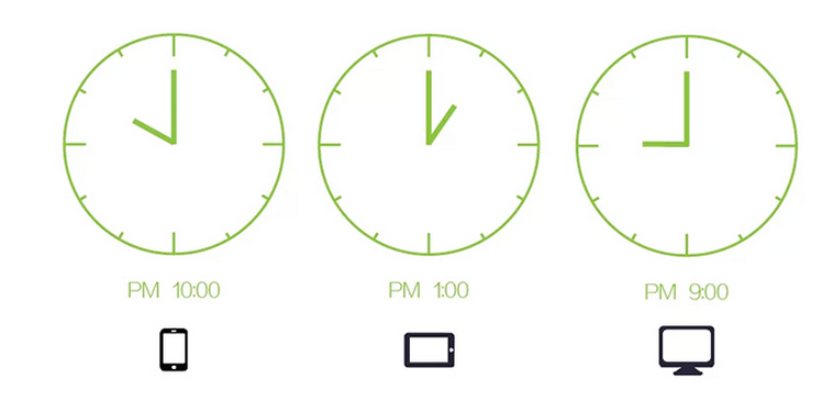 手機端分享最高峰在晚上10點 ; 平板端分享最高峰在下午1點; 臺式機和筆記本分享最高峰在晚上9點