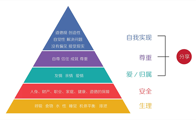 根據(jù)馬斯洛需求層次理論(下圖),每個人自下而上都有對“生理、安全、愛和歸屬、尊重、自我實現(xiàn)”5種層次的需求,并且,人們只有對低層次的需求得到滿足后,才會追求更高一層級的需求;而“分享”就是人在得到“生理、安全”這兩種層次需求的滿足后,進(jìn)而追求其它三種更高層次需求時所表現(xiàn)的一種行為。