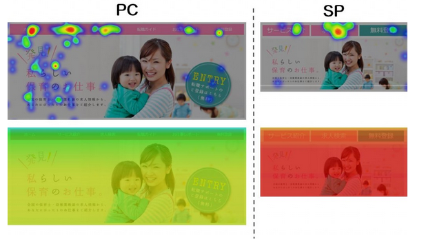 首先有差異的就是第一條幅中的banner上的點(diǎn)擊。有些頁面區(qū)域在PC上被點(diǎn)擊但在移動終端上未被點(diǎn)擊。由于SP受屏幕大小限制,不能較大的展示出來,所以用戶就不是很想去點(diǎn)擊。另外,再看看注意力視圖,PC上基本沒被怎么閱覽(不夠紅),而SP上閱覽視線就比較集中、變紅了。