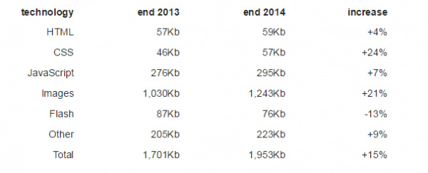 隨著基礎(chǔ)設(shè)施的發(fā)展,我們的網(wǎng)速是越來(lái)越快了,那你是否感受到網(wǎng)頁(yè)加載速度變快了呢?有沒(méi)有想過(guò),網(wǎng)頁(yè)也在逐漸變臃腫?根據(jù)HTTP Archive的報(bào)告,在調(diào)查了約50萬(wàn)網(wǎng)頁(yè)后,他們發(fā)現(xiàn)每個(gè)網(wǎng)頁(yè)的平均容量稍小于2Mb,達(dá)到了1953Kb,比去年上升了15%。 當(dāng)然,調(diào)查的網(wǎng)站不包括那邊復(fù)雜的網(wǎng)頁(yè)應(yīng)用。去年,這一上升比例是32%,雖然今年幅度縮小,但同樣不令人樂(lè)觀。