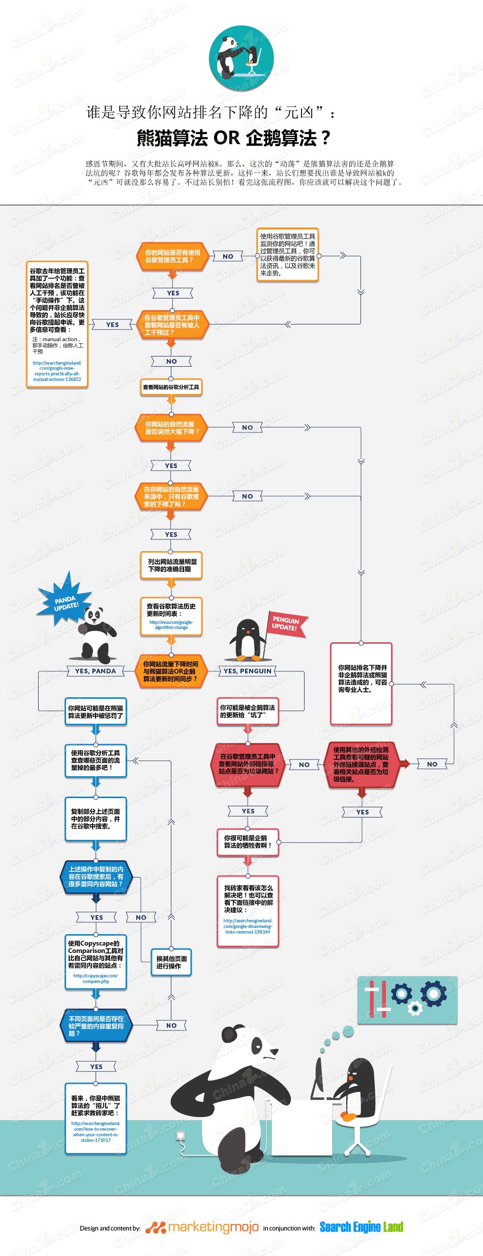 站長(zhǎng)之家(Chinaz.com)12月12日消息。 近來(lái),很多站長(zhǎng)反映,感恩節(jié)期間網(wǎng)站排名出現(xiàn)較大變動(dòng),部分網(wǎng)站排名上升,另一部分網(wǎng)站遭遇被K命運(yùn)。我們都知道,前段時(shí)間谷歌更新了企鵝算法(更新仍在繼續(xù))和熊貓算法。那么問(wèn)題來(lái)了,網(wǎng)站被K現(xiàn)象到底是誰(shuí)害的呢?企鵝算法 OR 熊貓算法?針對(duì)這個(gè)問(wèn)題,國(guó)外SEO從業(yè)者Driscoll Miller帶來(lái)了一張信息圖,為我們解說(shuō)到底是誰(shuí)讓你的網(wǎng)站排名下降了!