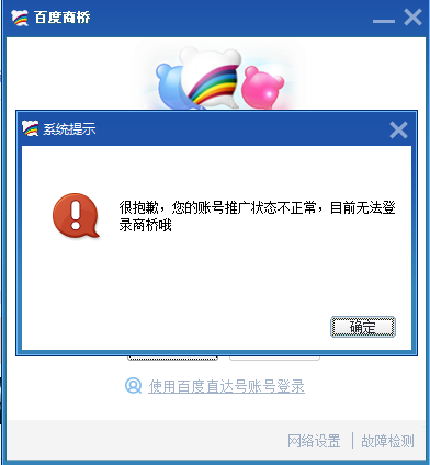 很抱歉,您的帳號(hào)推廣狀態(tài)不正常,目前無(wú)法登錄商橋哦...