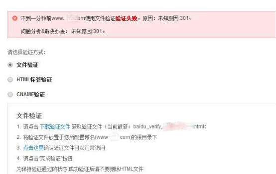 5、文件驗(yàn)證有時(shí)候也會(huì)出現(xiàn)驗(yàn)證失敗的情況。使用其它任意一種方式都可以,如果是301的問(wèn)題可以臨時(shí)修改服務(wù)器的配置,或者使用其它任意一種驗(yàn)證方式。