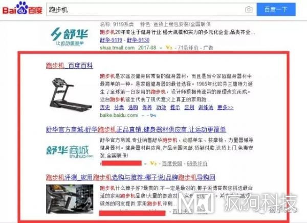 接下來(lái),我們通過(guò)搜索關(guān)鍵詞“跑步機(jī)”,來(lái)分析一下第一頁(yè),有哪些需求展示,(注明:根據(jù)搜索引擎的原則,誰(shuí)能更好的解決用戶需求,誰(shuí)就排名靠前)如下圖所示: