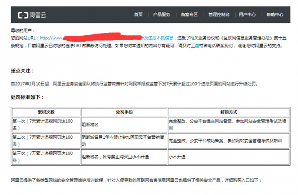 您的網(wǎng)站URL:http://www.********.com/weigui.html涉及違法不良信息,違反了相關(guān)服務(wù)協(xié)議和《互聯(lián)網(wǎng)信息服務(wù)管理辦法》第十五條規(guī)定,目前阿里云已對您的違法URL做屏蔽訪問處理。如果您對本通知的內(nèi)容存有疑問,請及時工單或者電話聯(lián)系我們, 謝謝您對阿里云的支持。